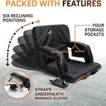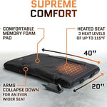 - FEEL AT HOME, ANYWHERE - Our heated seat is 20” wide, has a waterproof bottom and water-resistant construction to keep you nice and dry when the bleachers are wet. It comes with high-density memory foam cushions that feel like sitting on your couch. What’s more, our seat offers 6 adjustable reclining positions, back support and soft padded armrests.