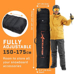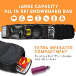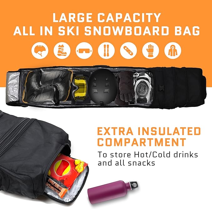 - LARGEST CAPACITY BAG – Our Bag measures at 170cm x 35.5cm x 16.5cm the largest on the market. With all this space this will slow your to store all Snowboard gear and snowboard accessories in your Snowboard bag. In Addition, there is an insulated pocket on top to store your drinks and keep it at its respective temperature.